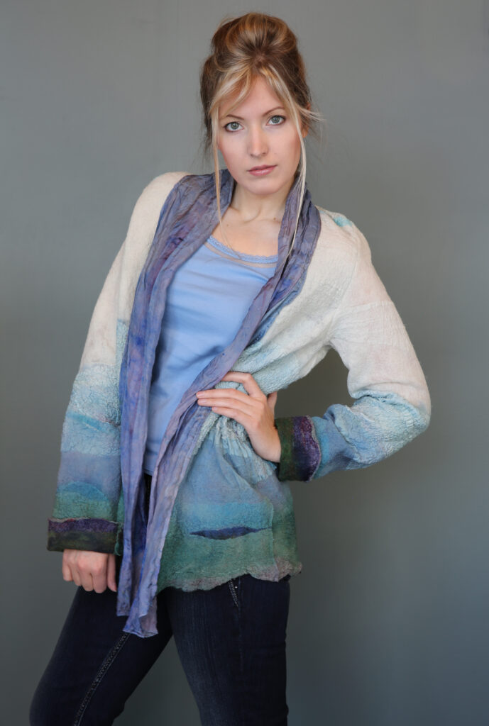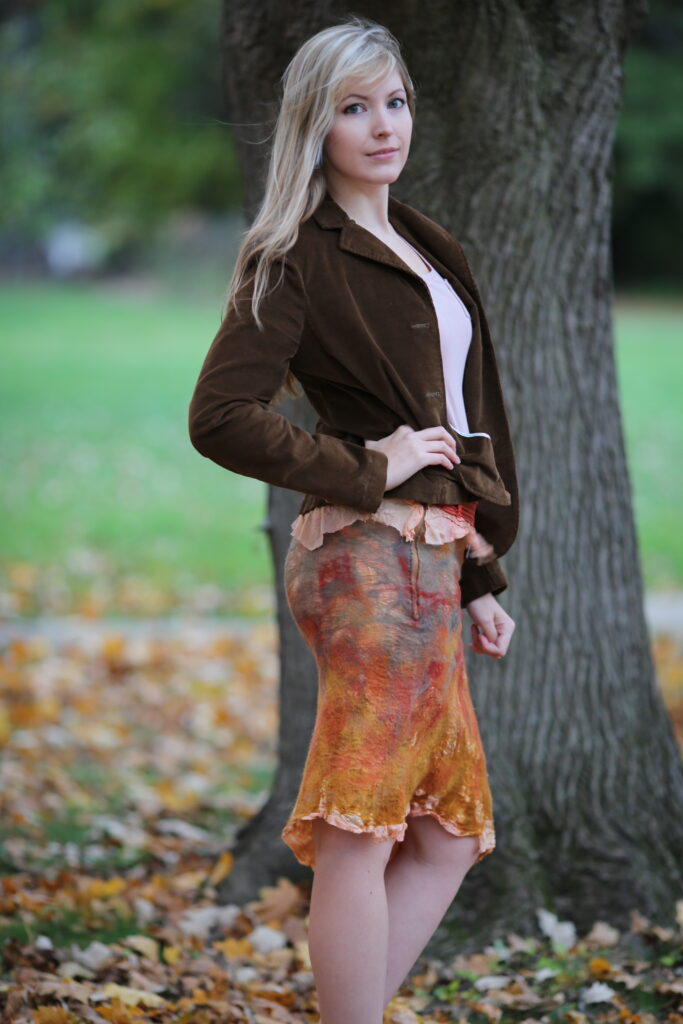 When I modeled one of her deep violet and earth-toned dresses, I felt transformed—like I was stepping into another world. The dress combined silk chiffon, nuno-felting, and wool fibers with beads stitched into the hem. It swayed like falling leaves, shimmering in the autumn light.