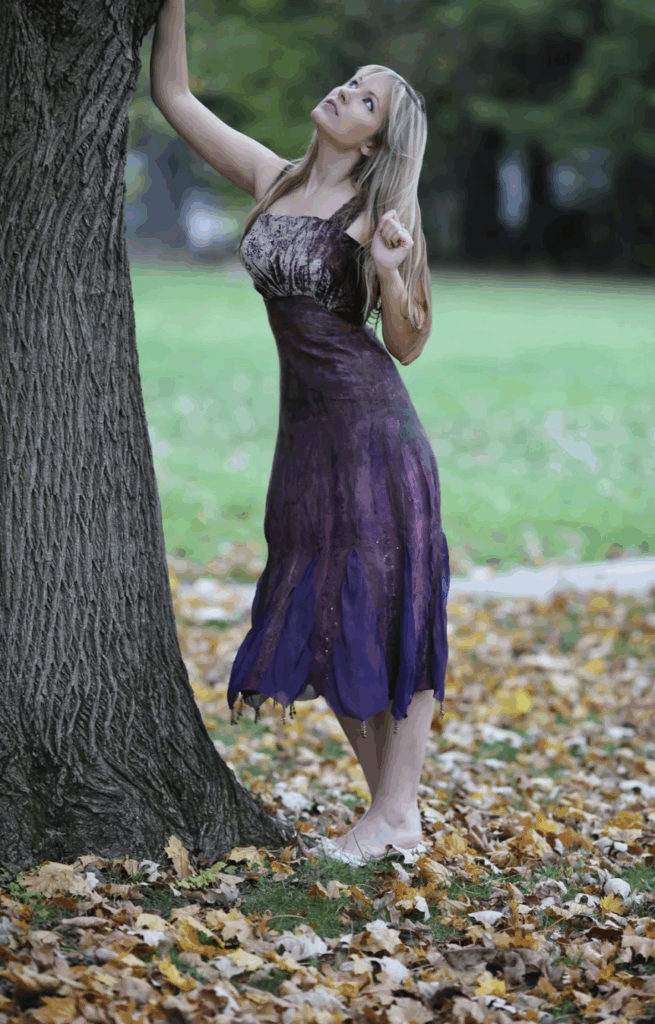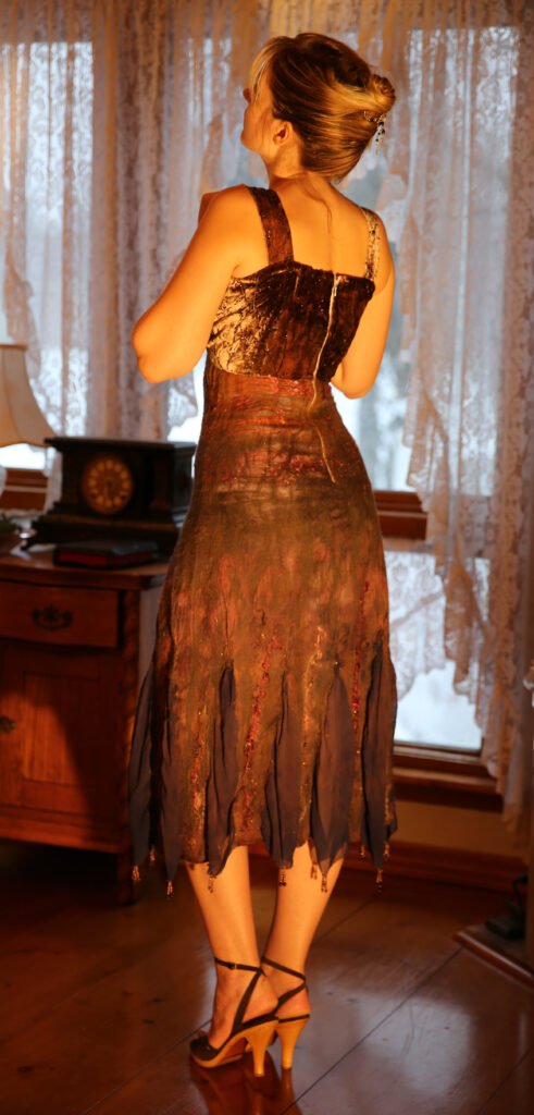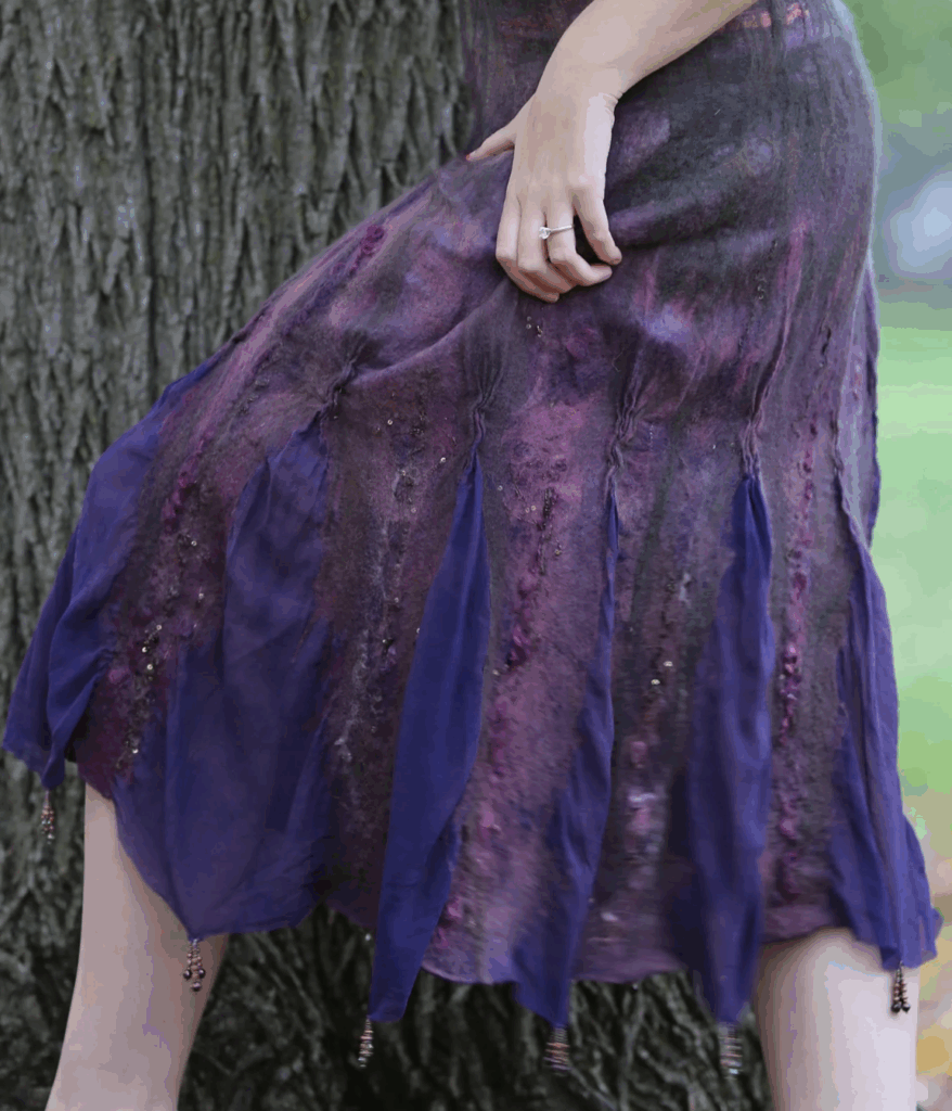 From there, Natasha worked her magic. Using nuno felting, she combined wool with layers of silk chiffon, creating panels that ripple and sway when you move. Tiny beads stitched into the hem catch the light, so when you walk through autumn leaves, the dress almost sparkles.