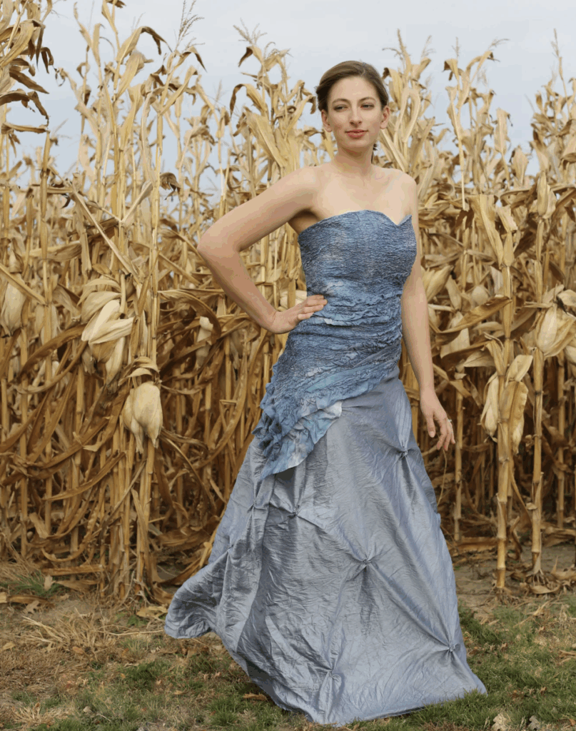 When you slip into a piece of her wearable art, you’re not just wearing a dress—you’re wearing a story. A story rooted in the land, nurtured on a family farm, spun from the wool of sheep her and my brother raise themselves, and carefully shaped into bold, one-of-a-kind designs that merge the worlds of agriculture, creativity, and education.